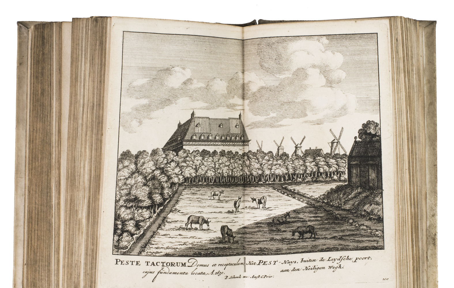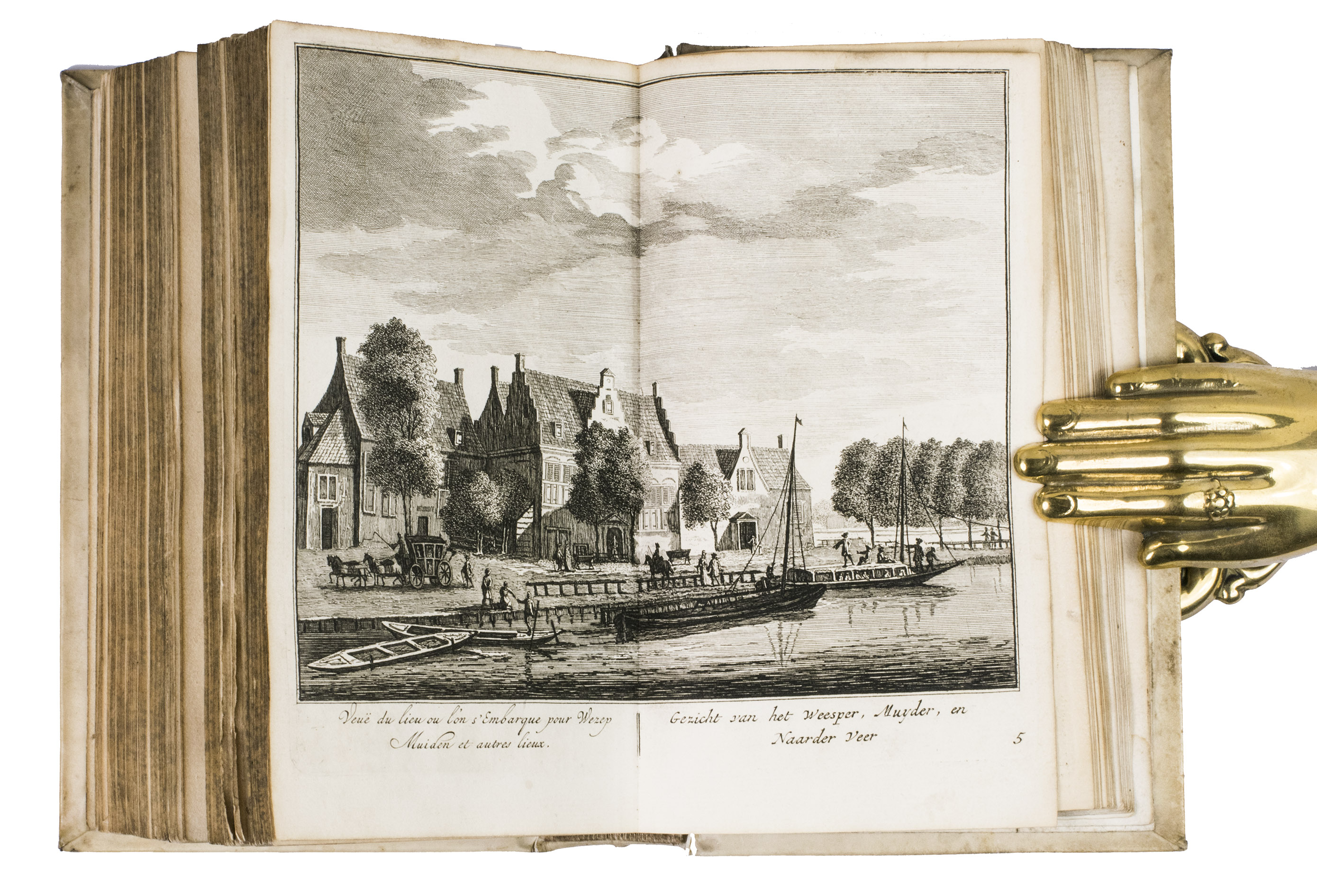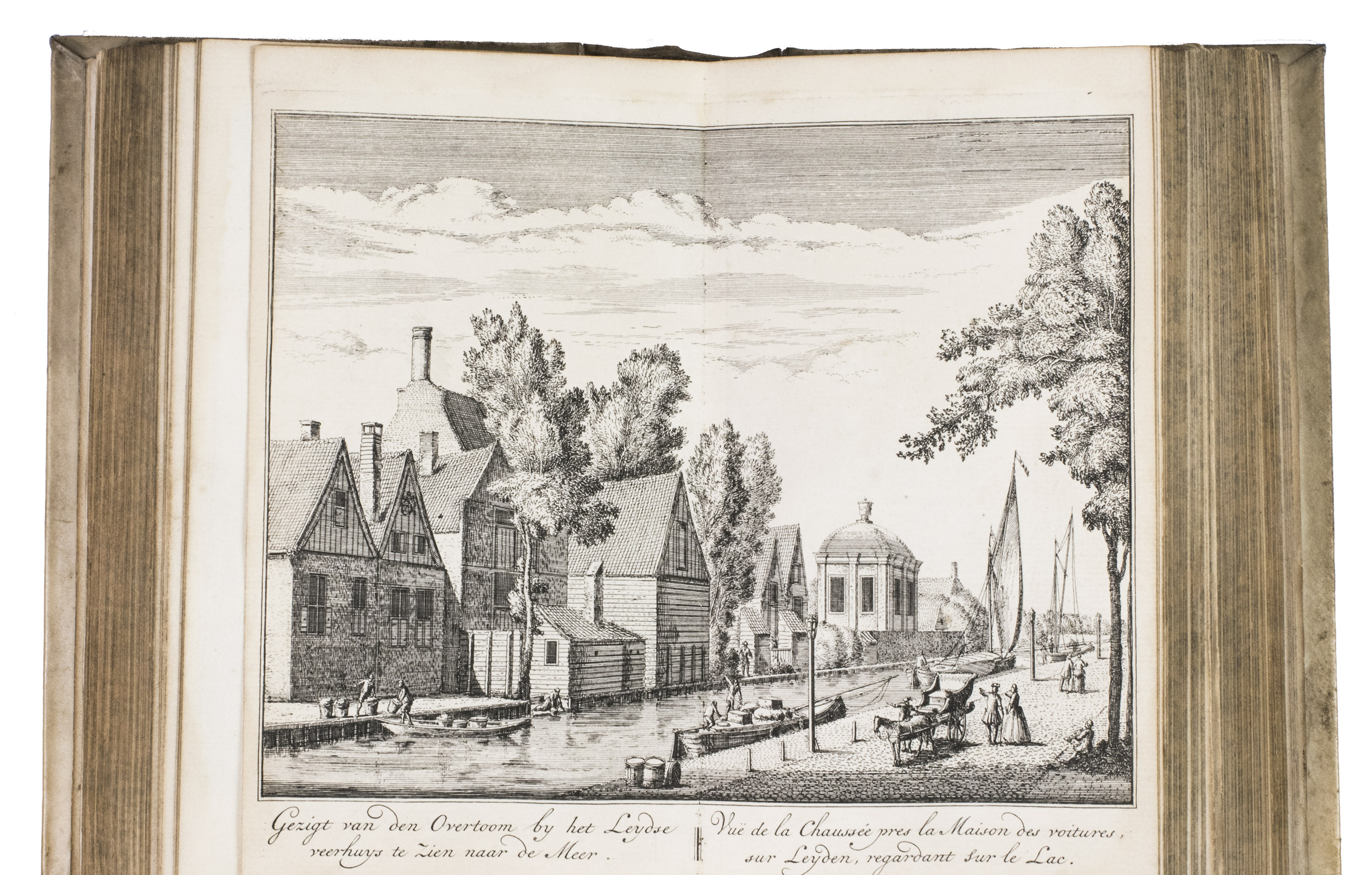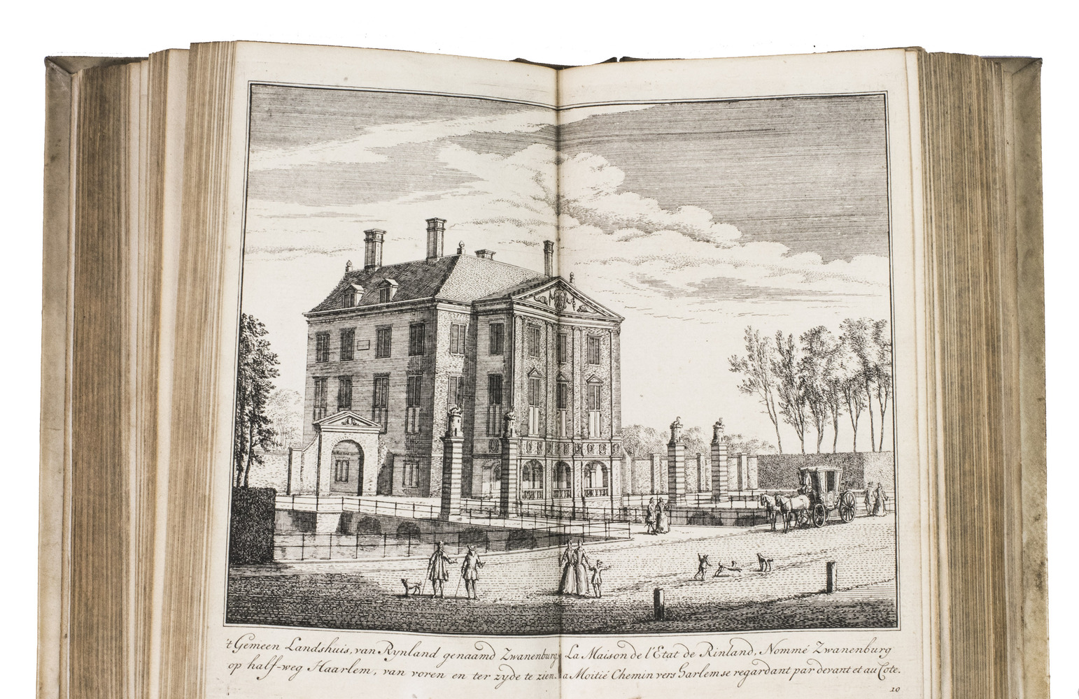 With a round, blind-stamped ownership mark of the Cistercians of Westmalle (Belgium) on page 15 in both volumes. The boards of both volumes are slightly rubbed and stained, the upper joint of the second volume is weakened, the lettering on the spine has faded. The volumes are slightly browned throughout, with a minor water stain in the final 10 leaves of the second volume. Otherwise in good condition, with very wide margins, and numerous extra plates. Haitsma Mulier & van der Lem 522; Nijhoff-van Hattum 335; STCN 180216414 (25 copies, of which 5 incomplete); cf. for the extra plates: Bertram, Noord-Hollandsche Arcadia, 2005; Van der Steur, Reizen door Nederland, pp. 399 (later ed.)