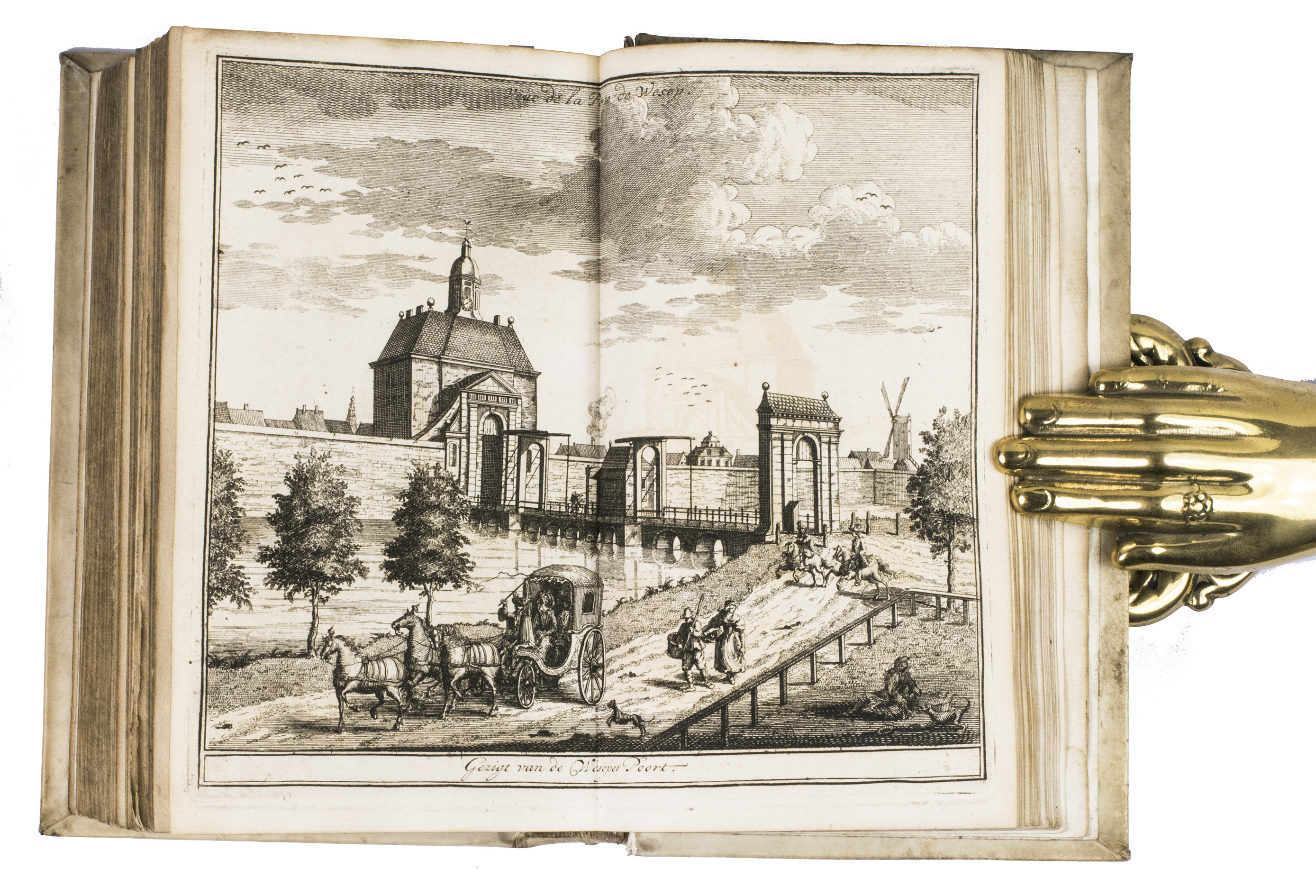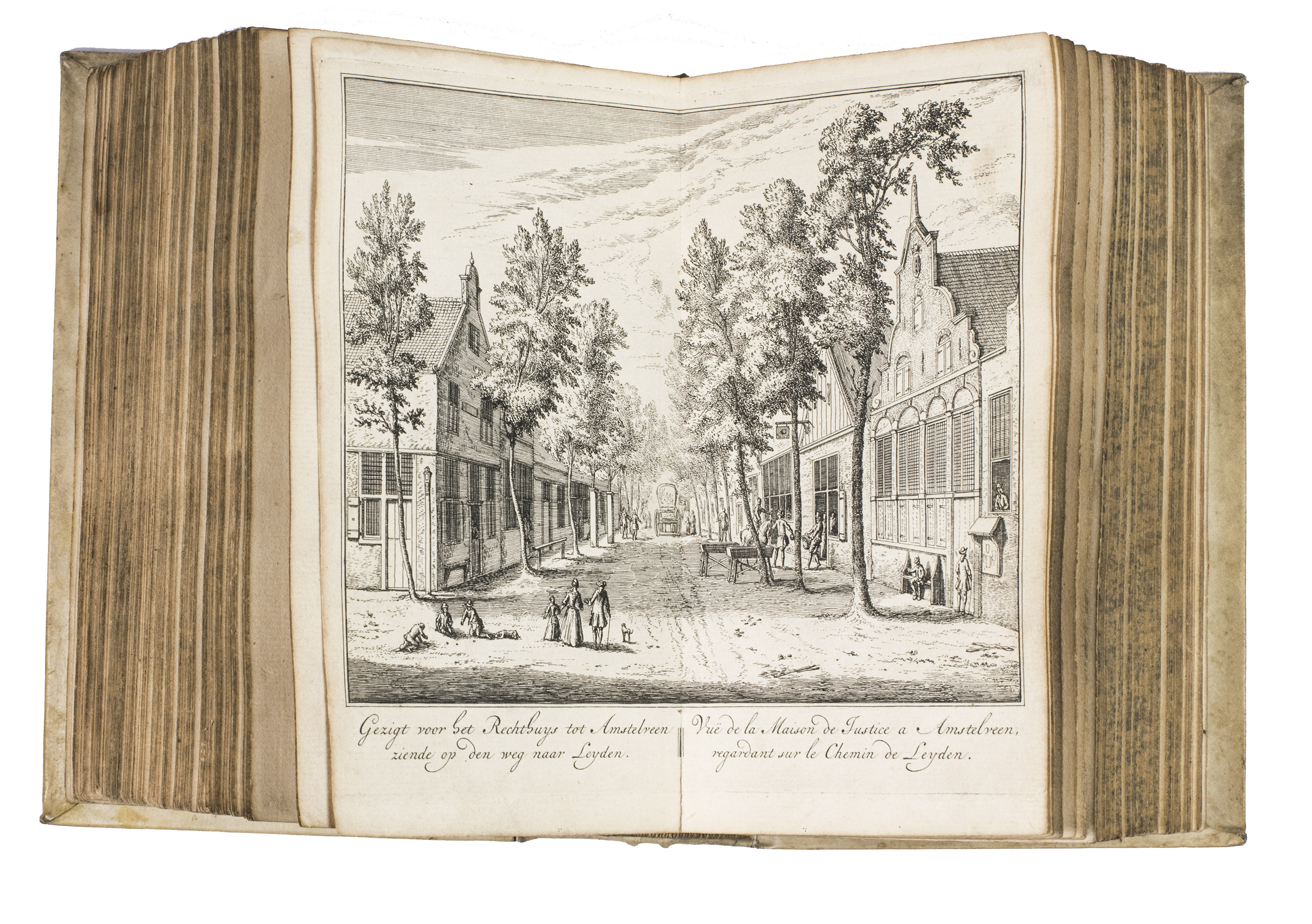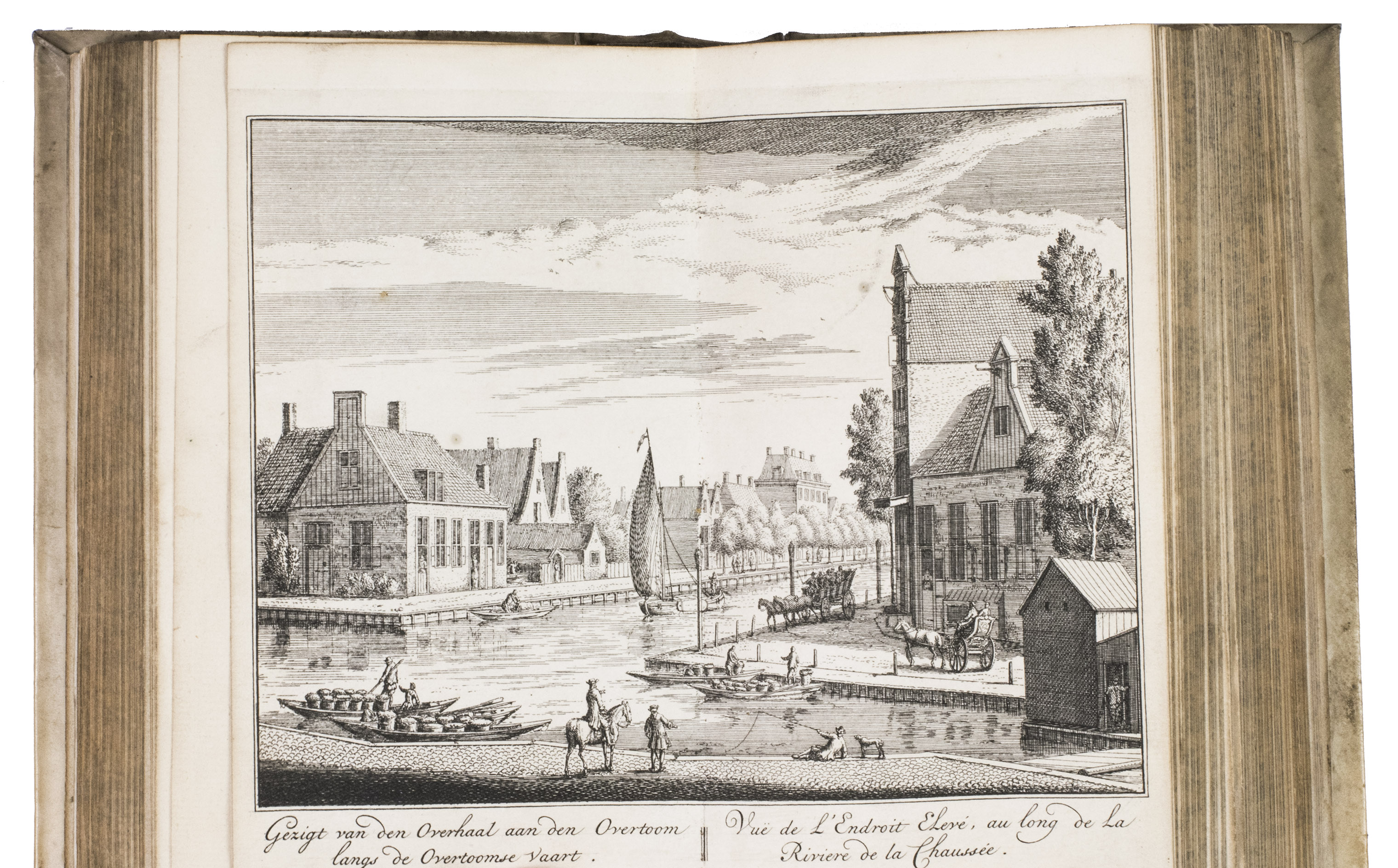 First edition of a descriptive travel account through Amsterdam and its surroundings, with wide margins, and 57 extra double-page plates. The work originally contained only 12 plates, but the present work includes 69. Most of the extra plates in the first part were taken from and produced by Abraham Rademaker and used in his Hollands Arcadia of de vermaarde Rivier den Amstel (1730). The second part borrows prints from Matthijs Pool's Verscheyde gesigten van de vermaarde rievier de buyten Amstel van de stadt Amsterdam, tot het dorp Ouwerkerk and Pieter Schenk's Afbeeldinge der voornaamste gebouwen van Amsterdam (18th century). The first volume also contains an added portrait of the author by Frederik Ottens, and a folding map of the city of Amsterdam.