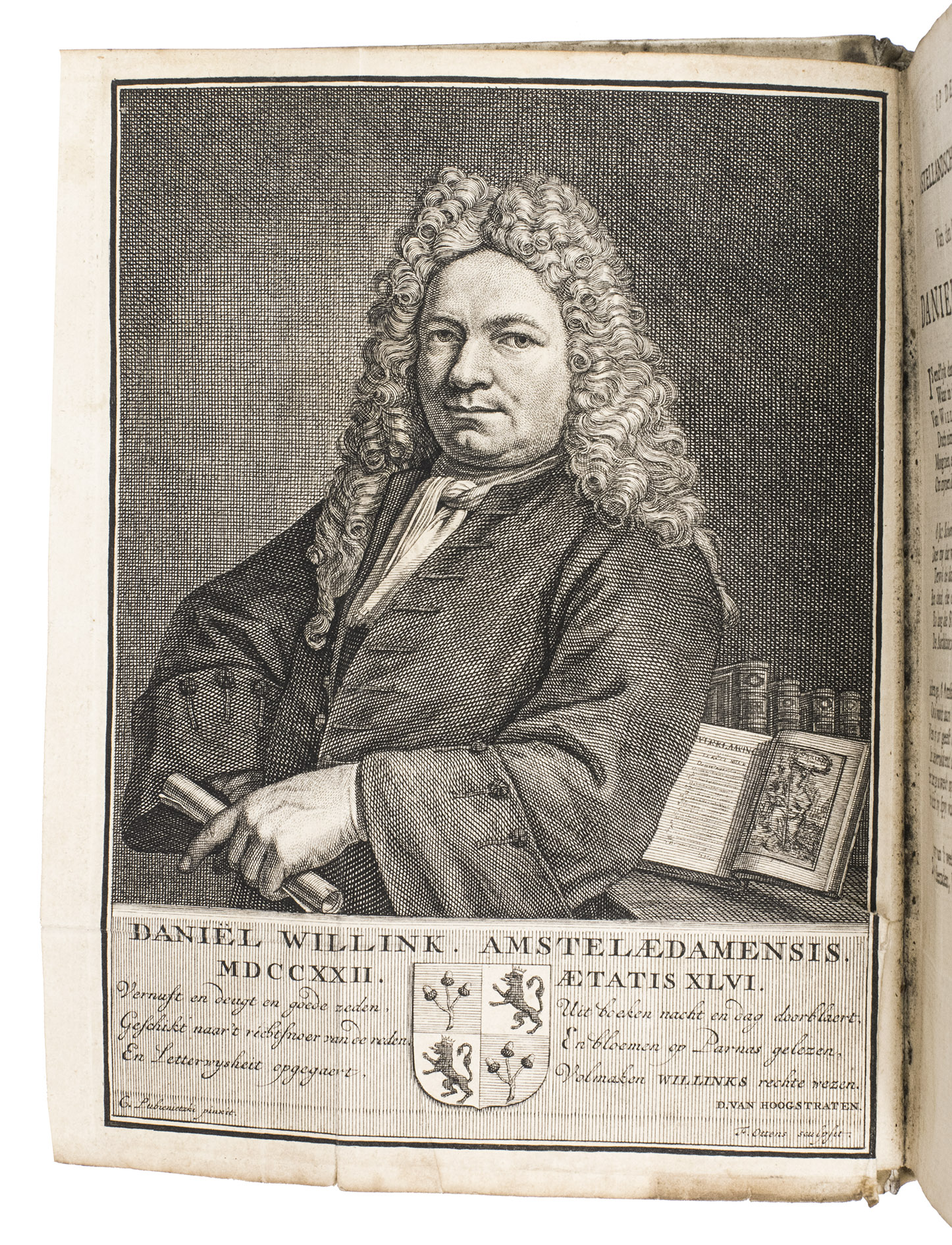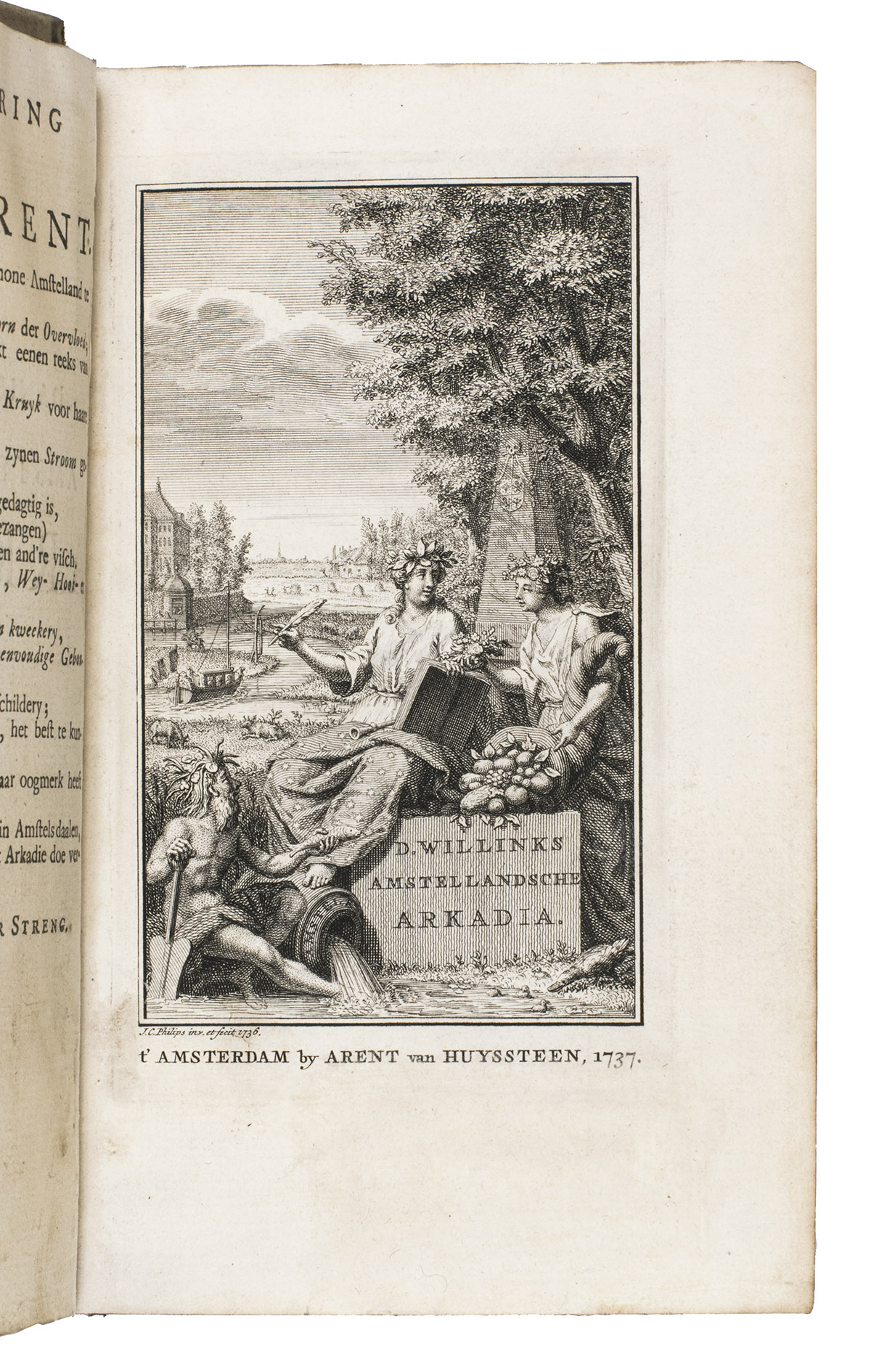 Daniël Willink (1676-1722) was a Dutch poet, writer and wine-merchant. In the present work, he describes with accuracy the places of interest of Amsterdam and surroundings, glorifying the beauty of the city and landscape. As he left his manuscript unfinished, the work was completed after his death by Gerrit Schoenmaker. Part one mostly describes Amsterdam and the Amstel river going south in the direction of Ouderkerk. The second part describes the cities western regions and the way to Haarlem. The original 12 double-page views show the Amstel river, Ouderkerk, Amstelmond, Amstelveen, Waverveen, Sloten, Sloterdijk, the Haarlemmerpoort, and a few estates in the area, and were made by Jan Casper Philips and Jan Punt after Cornelis Pronk and Abraham de Haen. The work was reprinted in 1773.