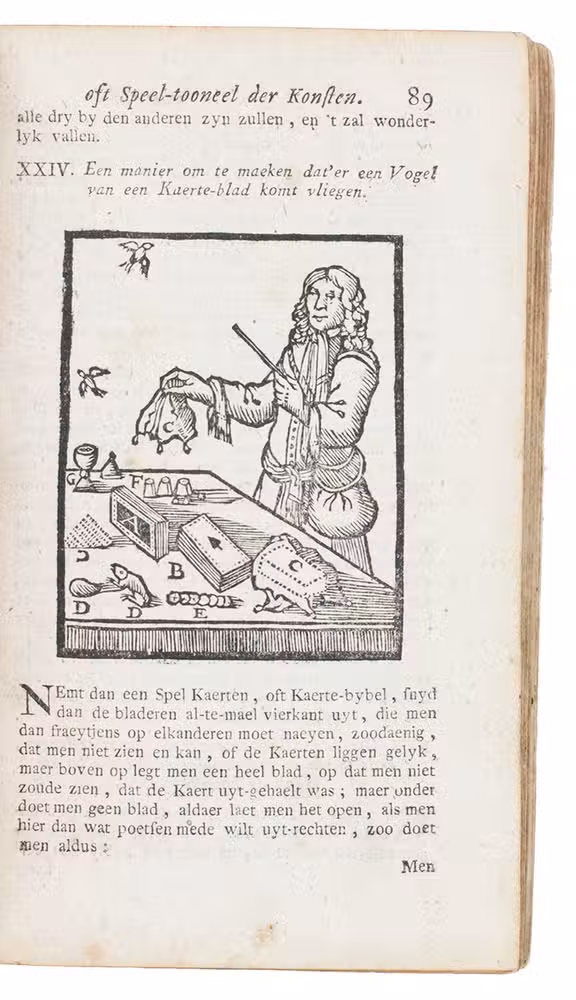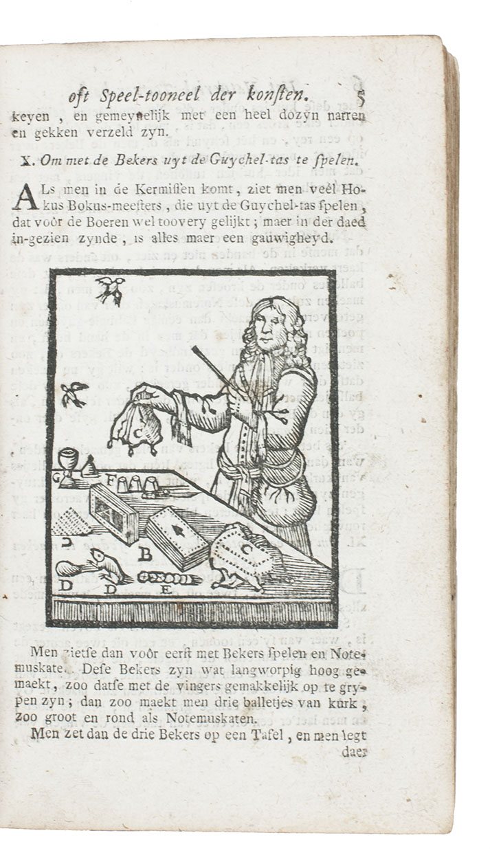 Easily the most popular Dutch conjuring and recreation book of the 18th century. On long winter evenings families and parties amused themselves with the help of the book, trying the various tricks and games. It contains about 2000 conjuring tricks, card games, exciting experiments with all sorts of materials, word and number games, riddles, etc. It also includes advice on drawing and colouring, on cosmetics, means of curing a pain, of making perfumed soaps, removing stains, etc. Reprinted for over a century the book continued amusing generations of children as well as adults in the home and at parties. Landwehr ascribes the book to Willem Goeree, who first published it at Middelburg in 1679. Goeree probably choose the pseudonym Witgeest (White spirit) as a guarantee that the book contained only white magic, not black magic. Its advice on drawing and colouring was taken from Goeree's Inleydinge tot de algemeene teyken-konst.