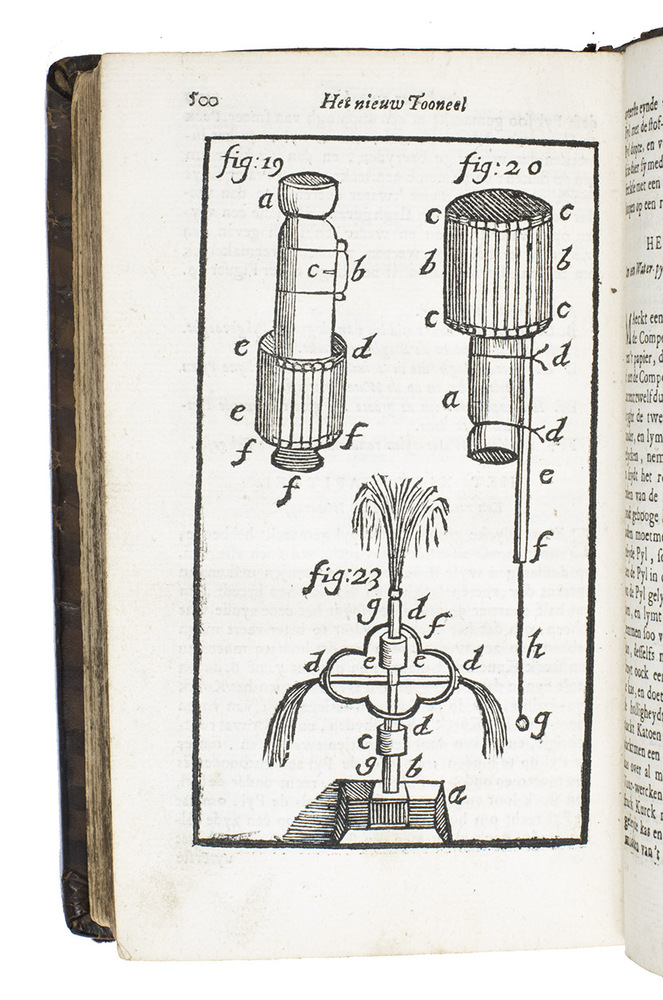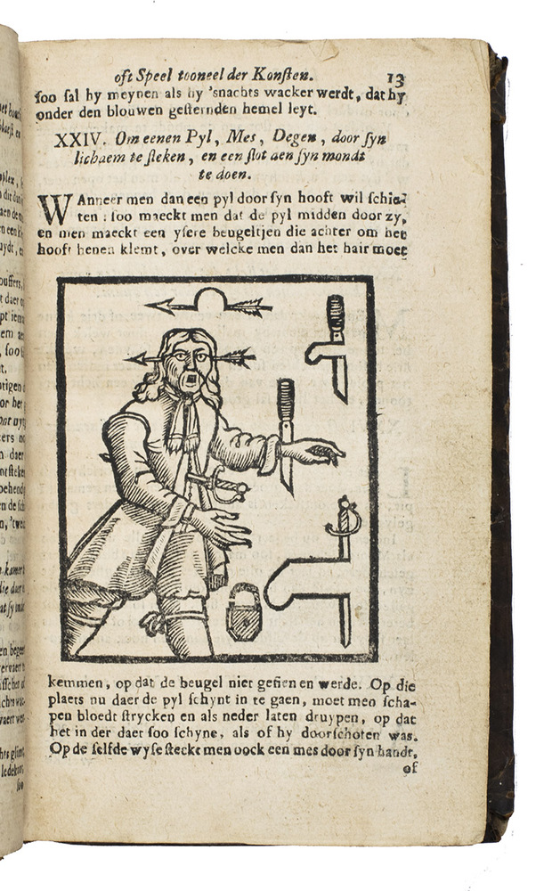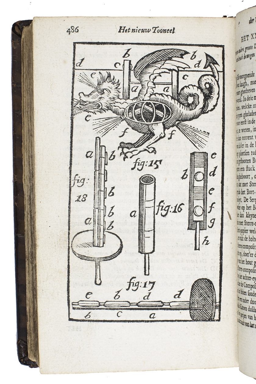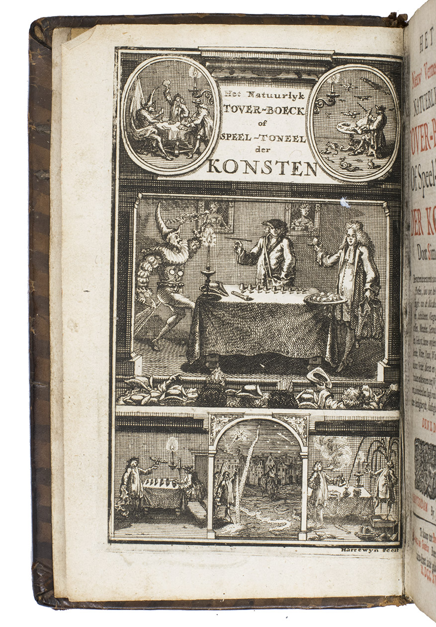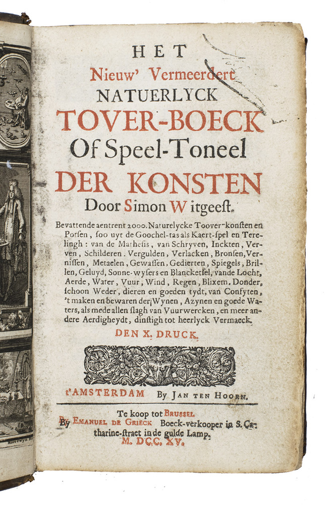 Easily the most popular Dutch conjuring and recreation book of the 18th century. On long winter evenings families and parties amused themselves with the help of the book, trying the various tricks and games. It contains about 2000 conjuring tricks, card games, exciting experiments with all sorts of materials, word and number games, riddles, etc. It also includes advice on drawing and colouring, on cosmetics, means of curing a pain, of making perfumed soaps, removing stains, etc. Reprinted for over a century the book continued amusing generations of children as well as adults in the home and at parties. Landwehr ascribes the book to Willem Goeree, who first published it at Middelburg in 1679. Goeree probably choose the pseudonym Witgeest (White spirit) as a guarantee that the book contained only white magic, not black magic. Its advice on drawing and colouring was taken from Goeree's Inleydinge tot de algemeene teyken-konst.