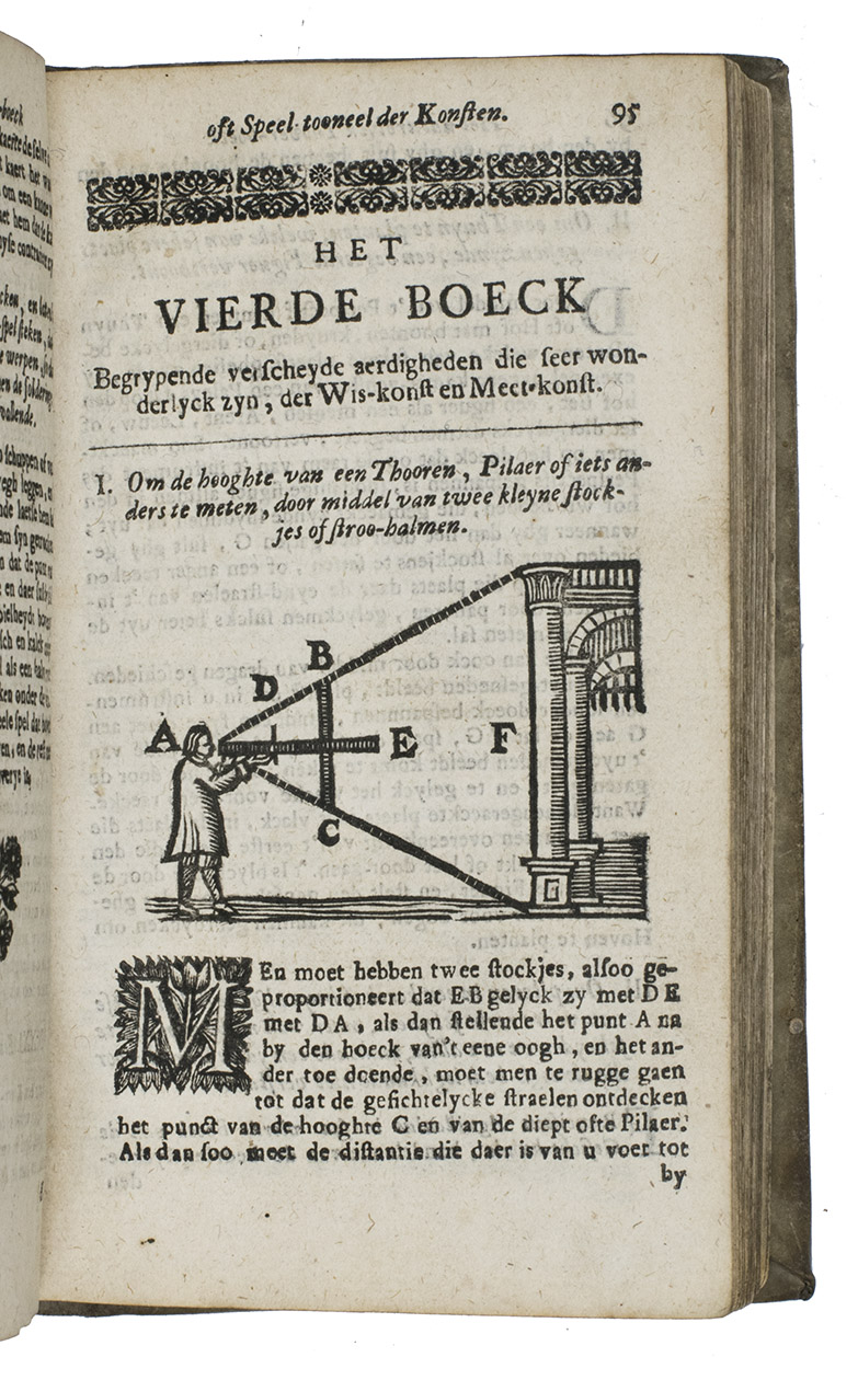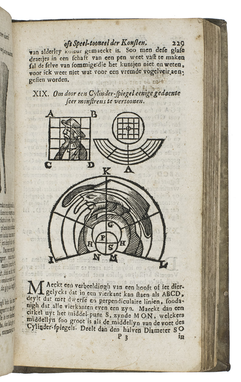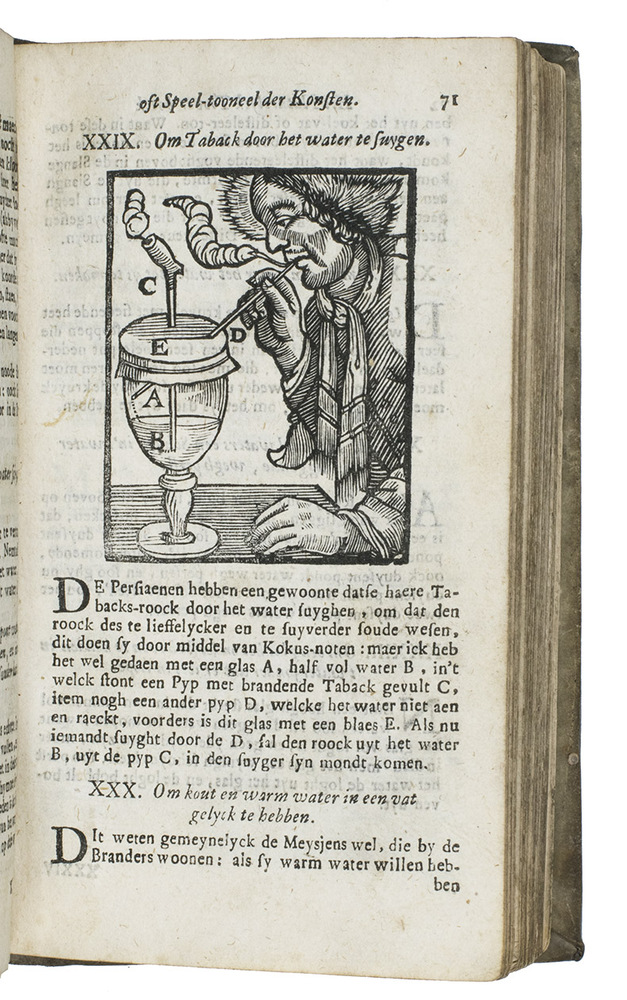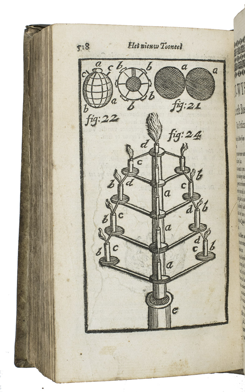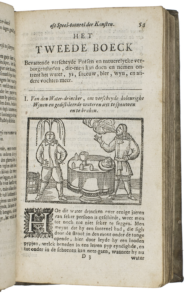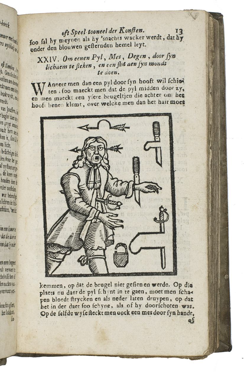 Amsterdam, Jan ten Hoorn (sold by Emanuel de Grieck, Brussels), 1715. 8vo. Title-page in red and black, with an engraved frontispiece containing 5 compartments showing tricks by Harrewijn after the frontispieces in the original editions by Jan van Hoorn in Amsterdam, 57 charming woodcuts illustrating the various tricks in the text (7 full-page in the last section on fireworks). Contemporary vellum, blind-tooled with a centrepiece on both sides. [10], 518, [40] pp.