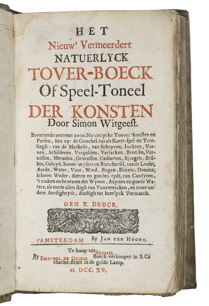 Het nieuw vermeerdert natuerlyck Tover-Boeck of Speel-Toneel der konsten. Bevattende aenstrent 2000 naturelycke Toover-konsten en potsen, soo uyt de Goochel-tas als kaert-spel en terelingh: van de mathesis, van schryven, inckten, verven, schilderen, vergulden, verlacken, ..., als mede allen slagh van vuurwercken ... Den X. druck.