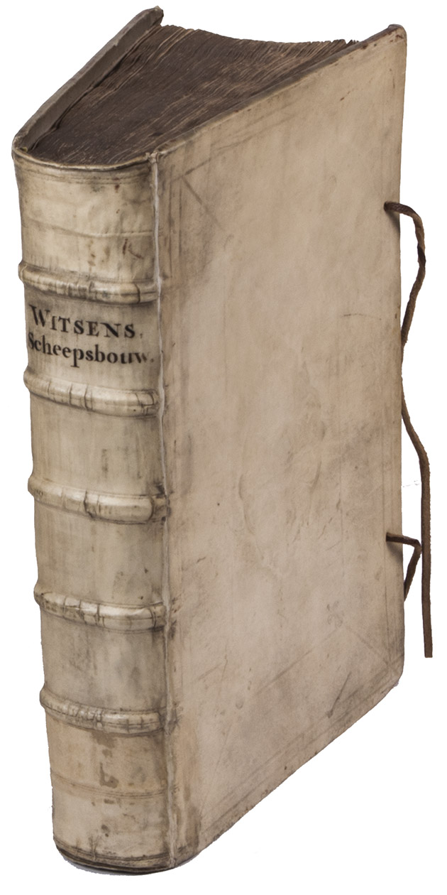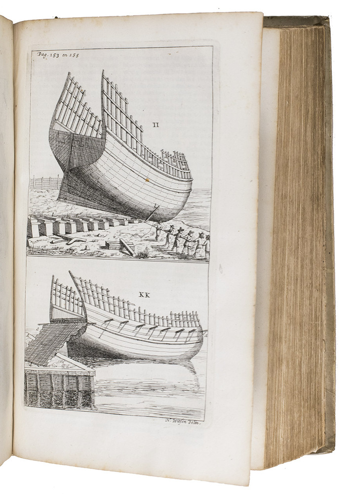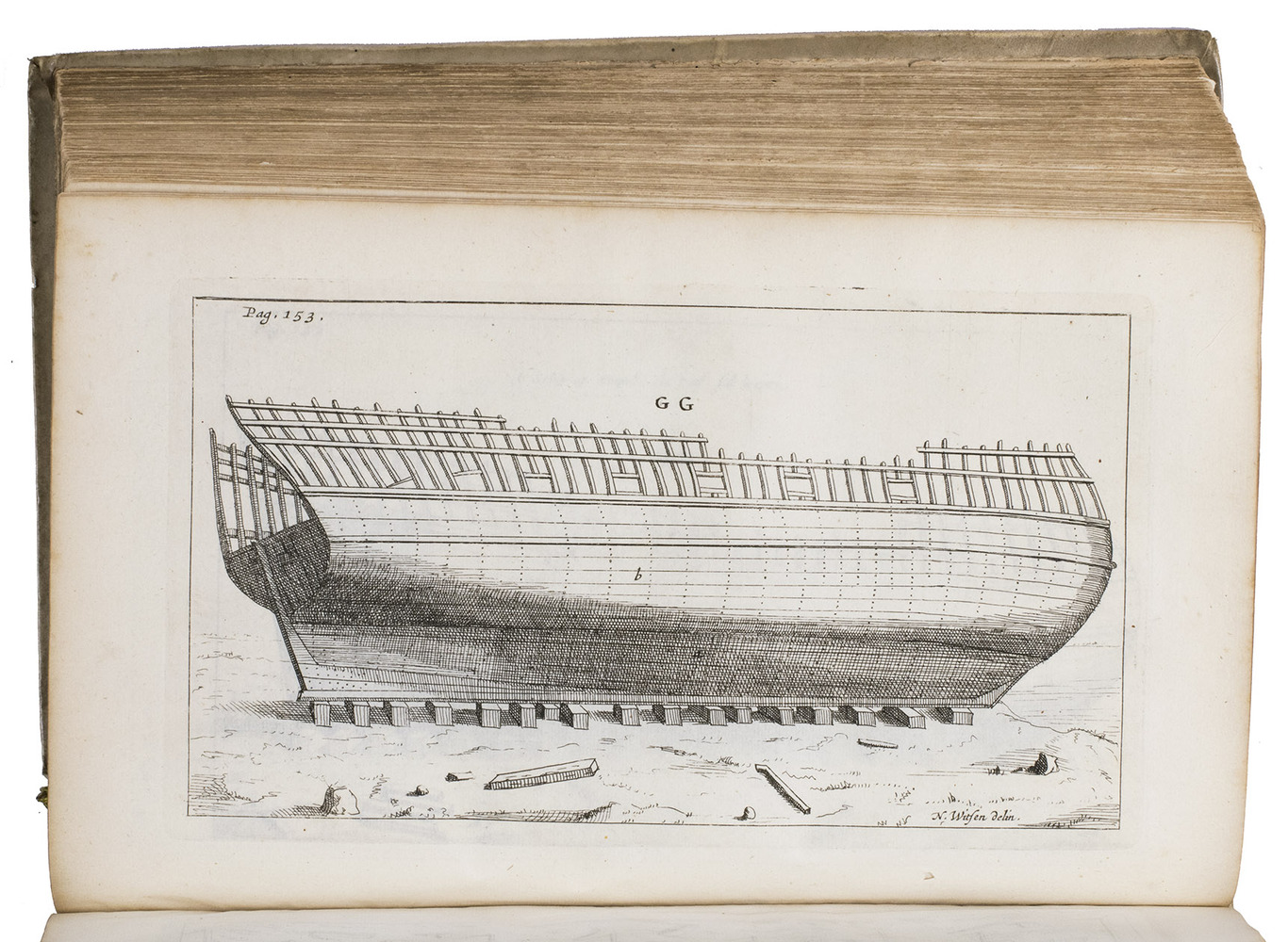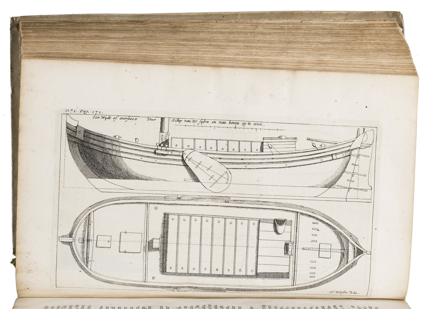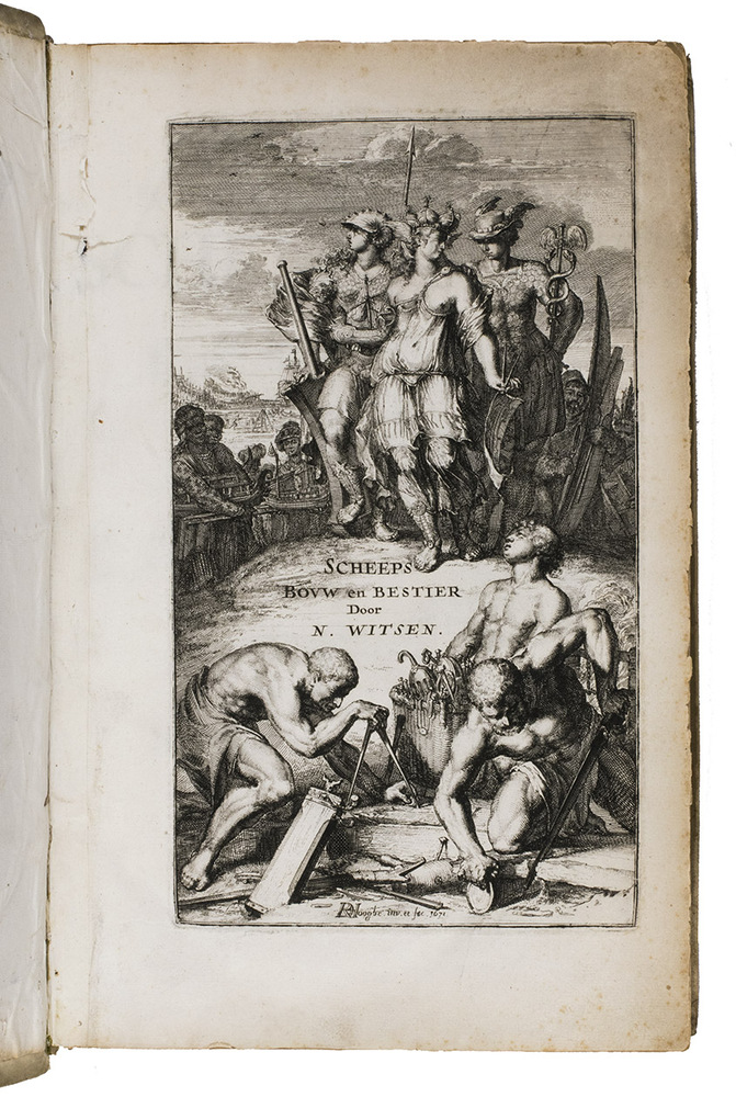 Extremely rare issue of the first edition of Witsen's incredibly influential work on 17th-century Dutch shipbuilding techniques and styles. The other issue appeared in the same year with the impressum of C. Commelijn and J. Appelaer, instead of C. Cunradus. Both contain the same engraved title page by Romeyn de Hooghe, but the principle difference can be found in the letterpress title page, with ours being printed in black and showing a different vignette.