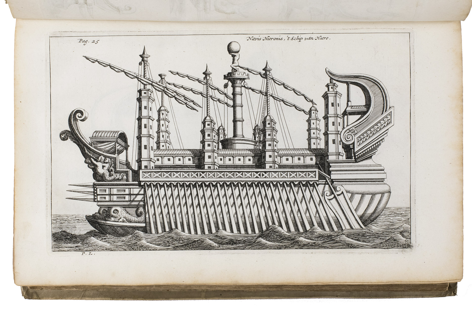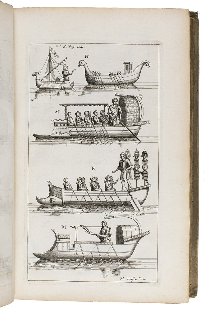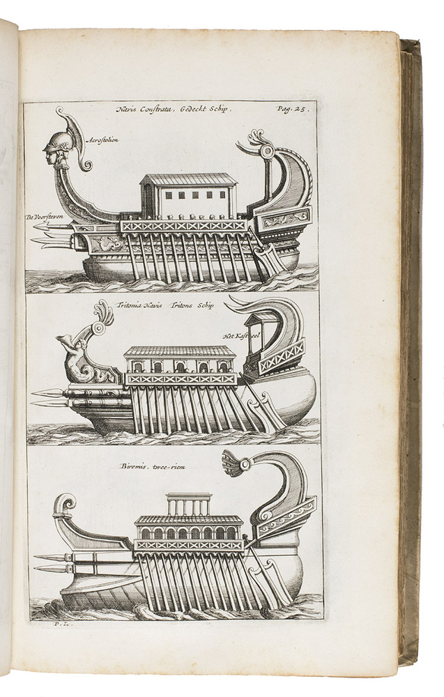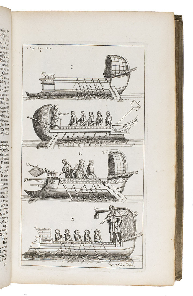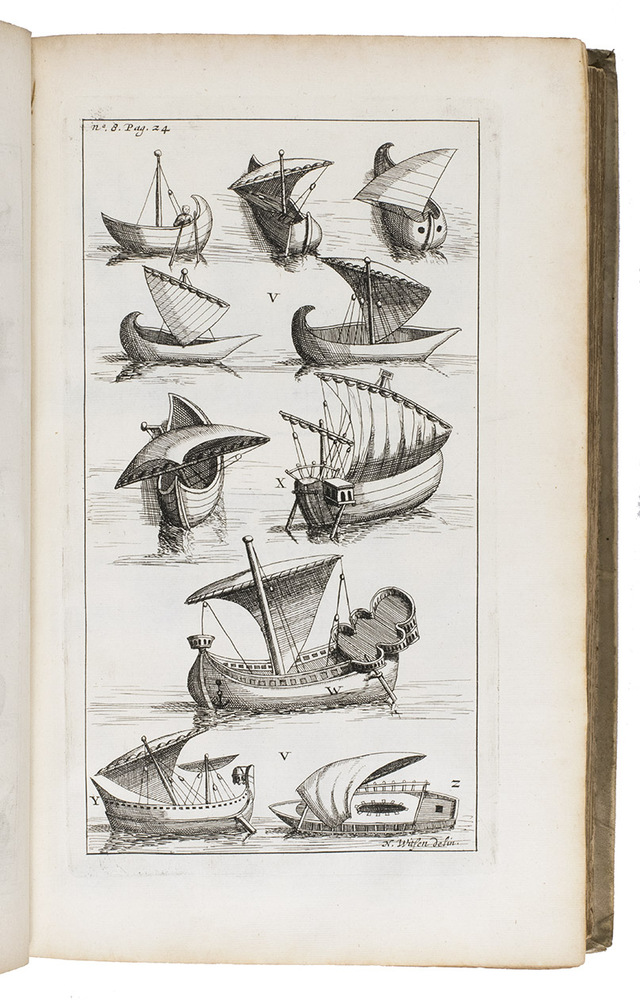Extremely rare issue of the first edition of Witsen's incredibly influential work on 17th-century Dutch shipbuilding techniques and styles. The other issue appeared in the same year with the impressum of C. Commelijn and J. Appelaer, instead of C. Cunradus. Both contain the same engraved title page by Romeyn de Hooghe, but the principle difference can be found in the letterpress title page, with ours being printed in black and showing a different vignette.