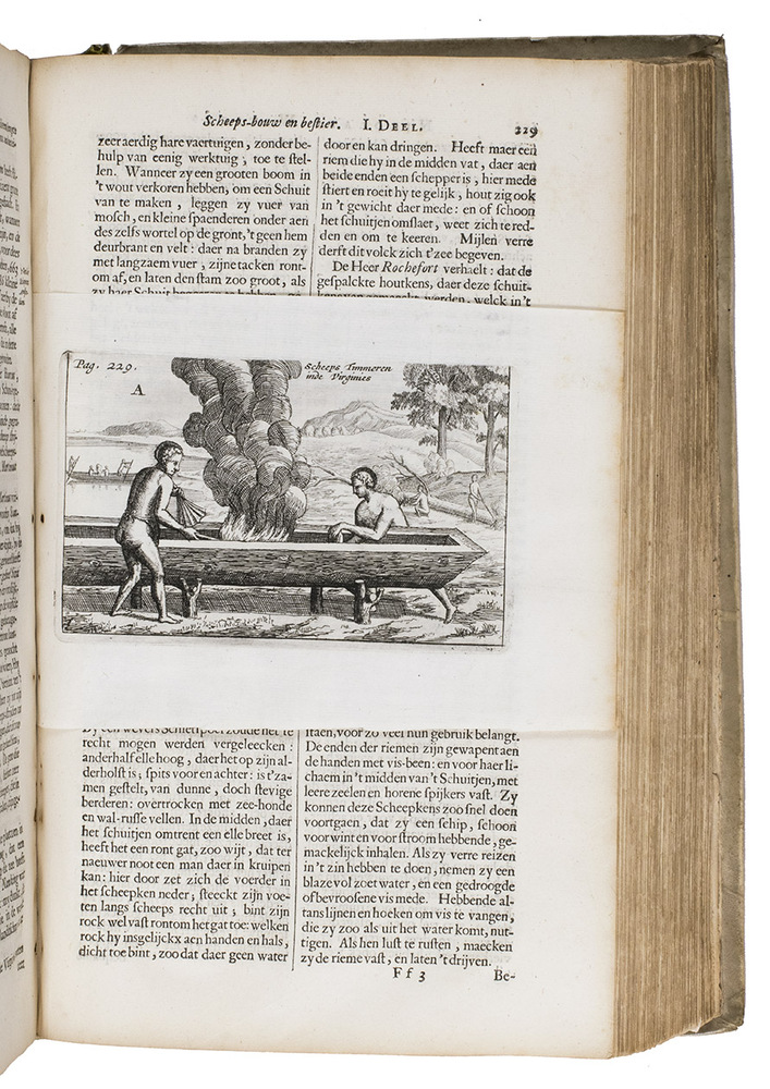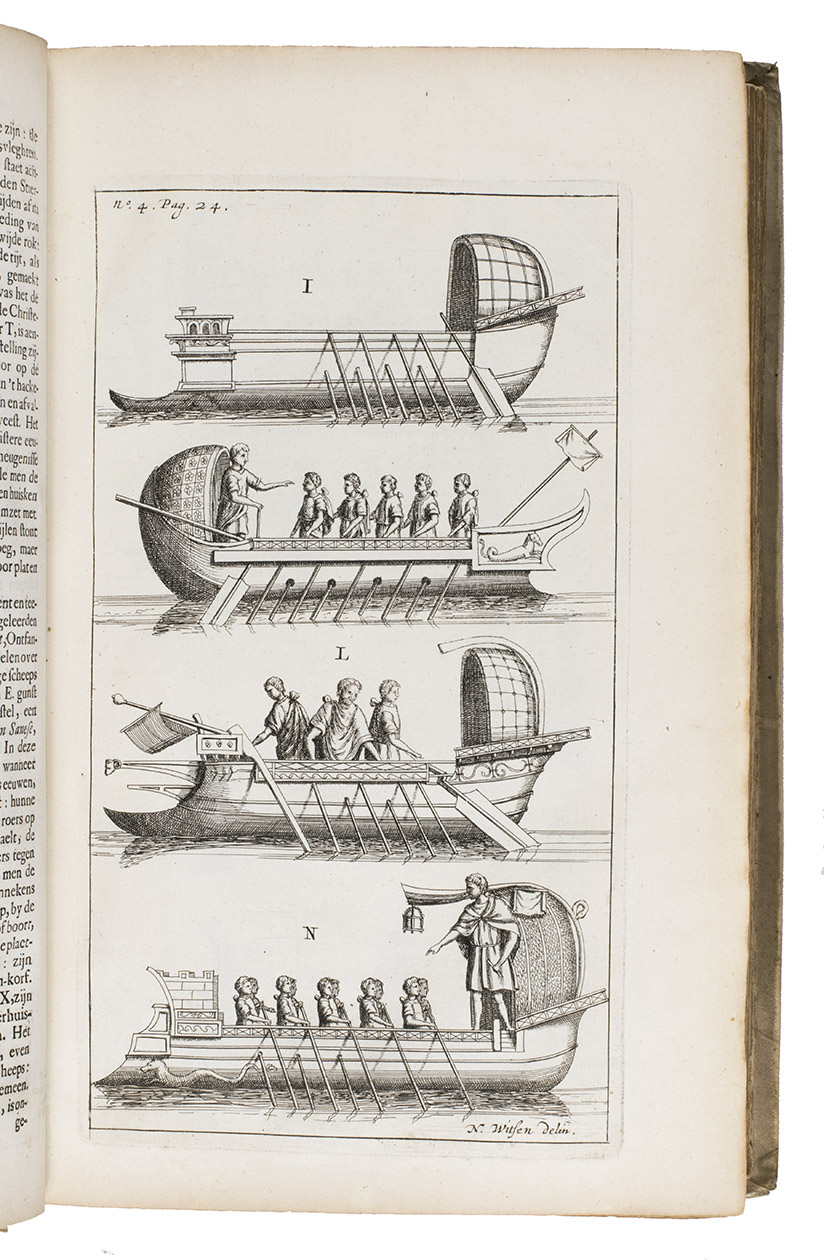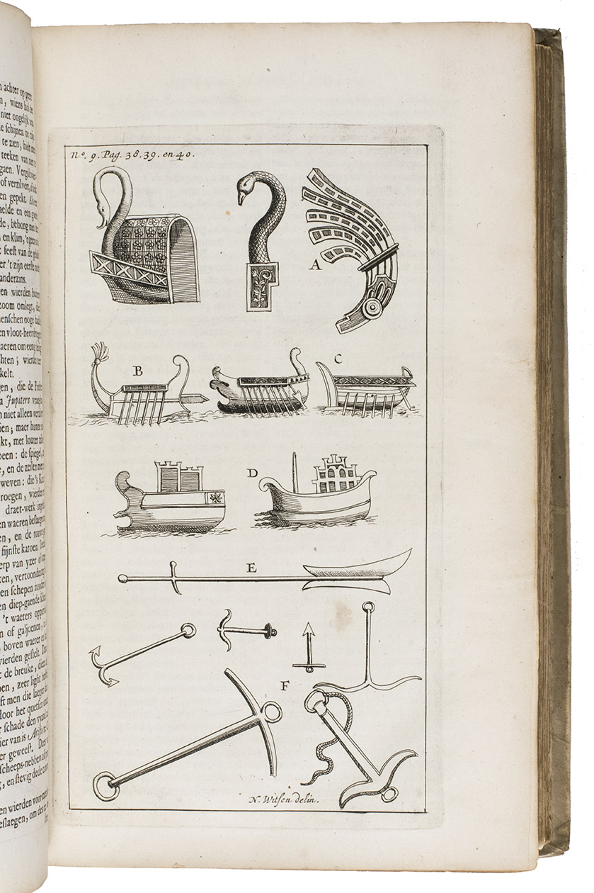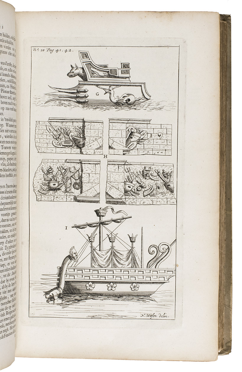 With a small 18th-century manuscript note tipped in before the letterpress title page: "Op het schip Hilversbeek (?) de Ao 1741 ...", a small black stamp on the front pastedown "10 [...?] 1969" and the printed coat of arms of Ortt pasted on the front pastedown next to the stamp. The binding is slightly scuffed, the front hinge has been reinforced and new brown leather ties have been added. The engraved title page is slightly damaged in the gutter, not affecting the engraving and with some small tears in some pages, not affecting the text or plates, the edges and outer margins are very slightly browned. Otherwise in very good condition. Bierens de Haan 5368; Hoogendoorn, Witsen N04; Landwehr Romeyn de Hooghe, 16; NHSM p. 743; NNBW IV, 1473; STCN 240219058 (2 copies).
