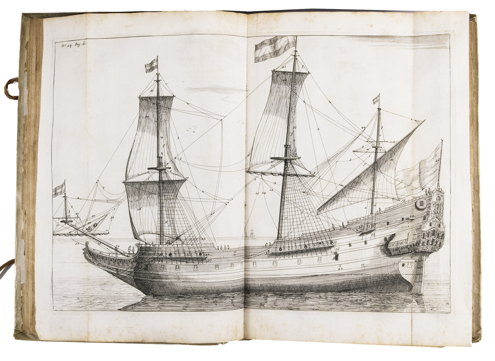 Notably, Witsen's work contains more than 110 meticulously detailed engraved plates based on drawings by the author himself. Considered the definitive work on shipbuilding, Aeloude en hedendaegsche Scheepsbouw was the product of Witsen's passion as a wealthy enthusiast and future regent. Only someone connected to regent circles would have had access to the exclusive information contained within its pages. The book, a precious item that required a deposit of twelve guilders, would primarily have graced the libraries of affluent members of Dutch society.