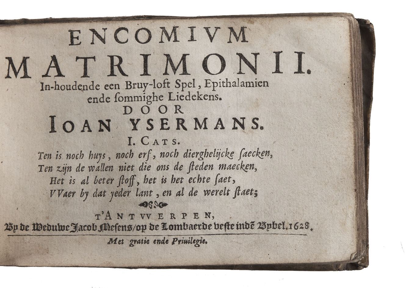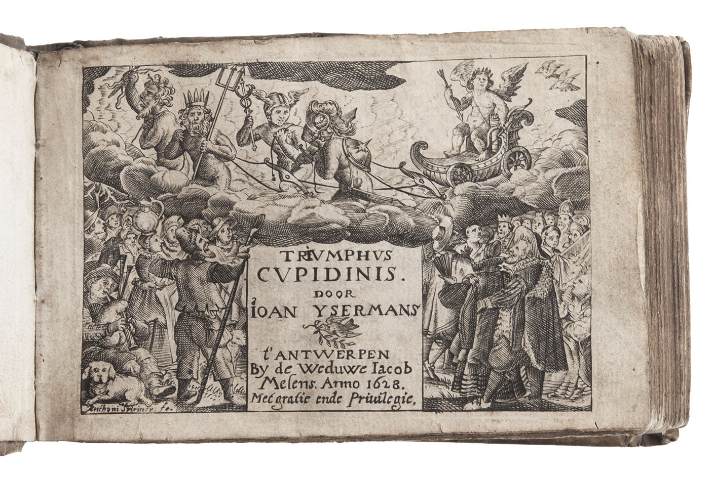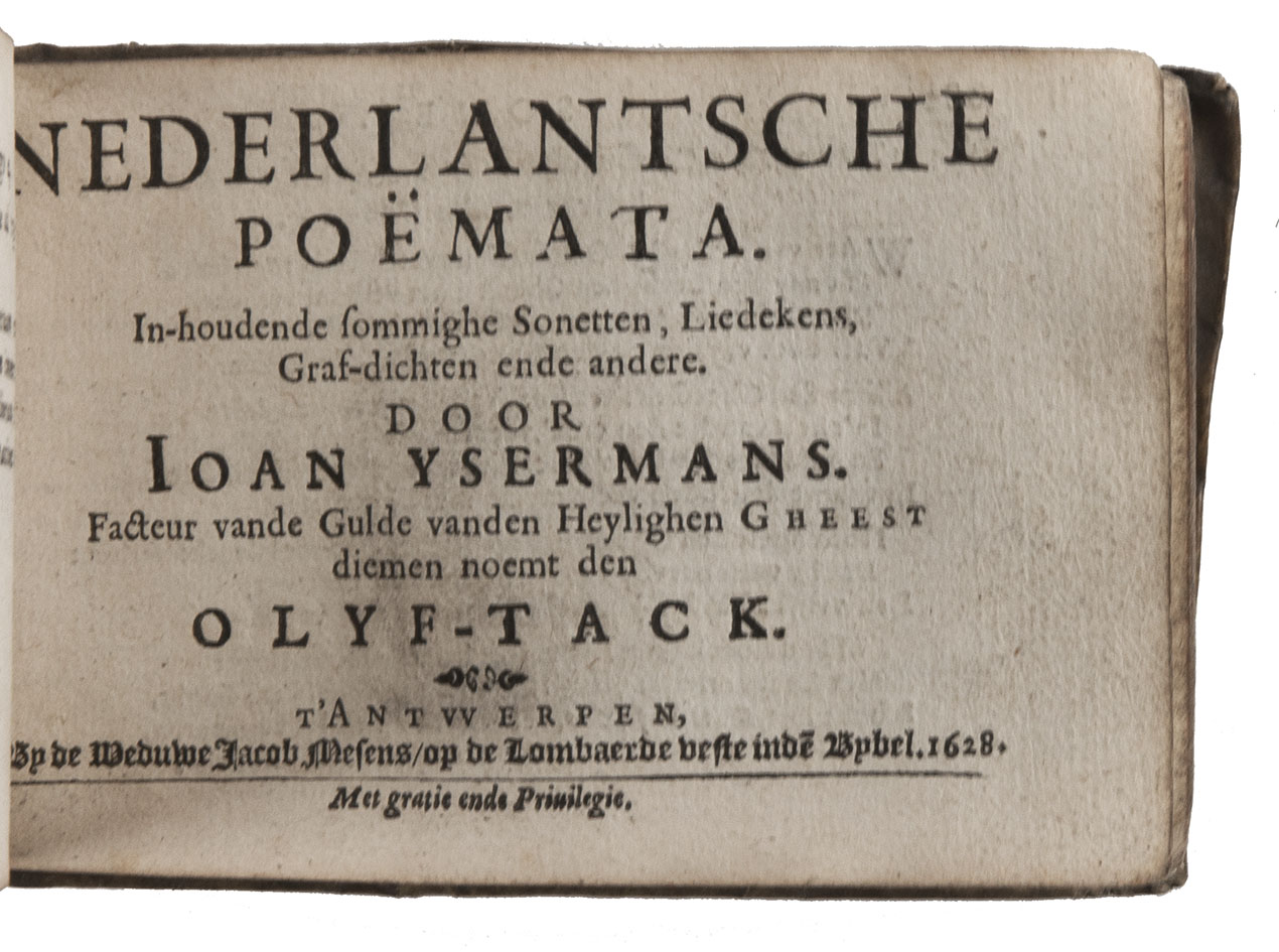 Rare first and only edition of a collection of Dutch songs and poems by the playwright Joan Ysermans, member of the Antwerp chamber of rhetoric "De Olijftak". The work is divided in three parts and contains many songs from the unpublished plays of the author, with light-hearted love songs in the first and second parts and more serious poems in in third. In 1633 appeared, as an explicit reaction against the secular character of Yserman's work, the anonymous Triumphus Jesu, containing devotional songs and poems.