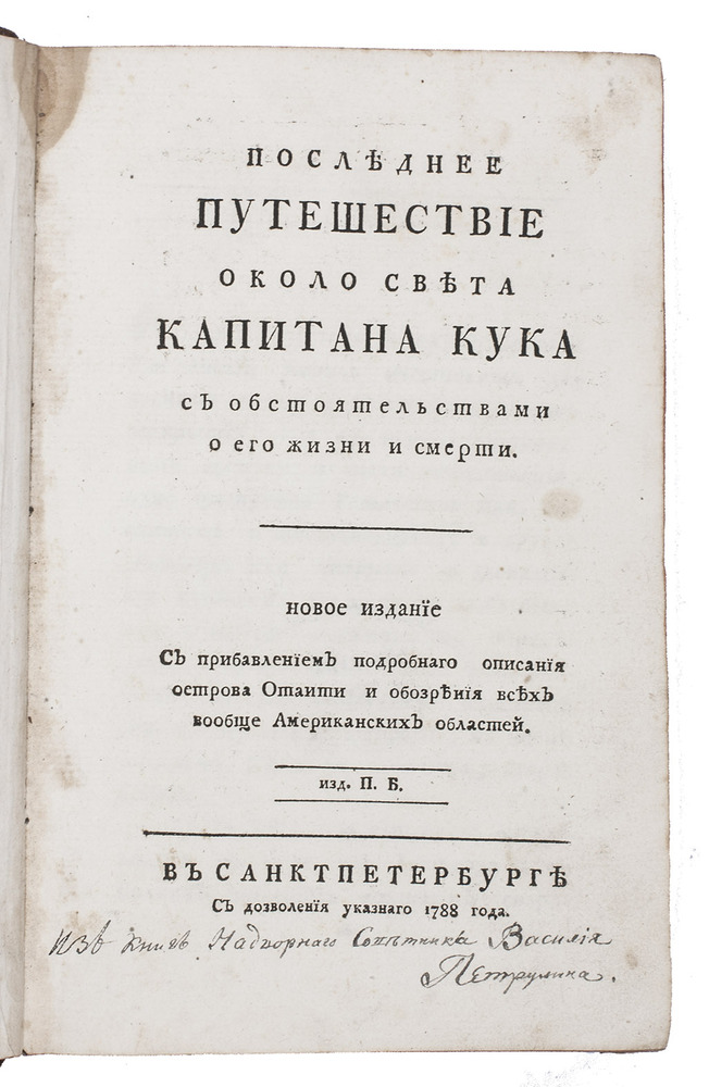 Extremely rare second Russian edition, revised and augmented, of Heinrich Zimmermann's valuable account of Cook's third and final voyage, with a description of Cook's death at Kealakekua Bay, Hawaii. Zimmermann's account is followed by articles on Tahiti, a life of James Cook, and an essay on America in general, abridged from the Akademicheskiia izviestiia for 1781 and not included in the first Russian edition of 1786. Though Cook famously discovered Hawaii during his third voyage, Russian interest centred on his explorations of the American Northwest coast, where Russian fur traders had tried to establish permanent posts since the 1770's. Indeed, the first permanent Russian settlement was established only four years prior to the present publication.