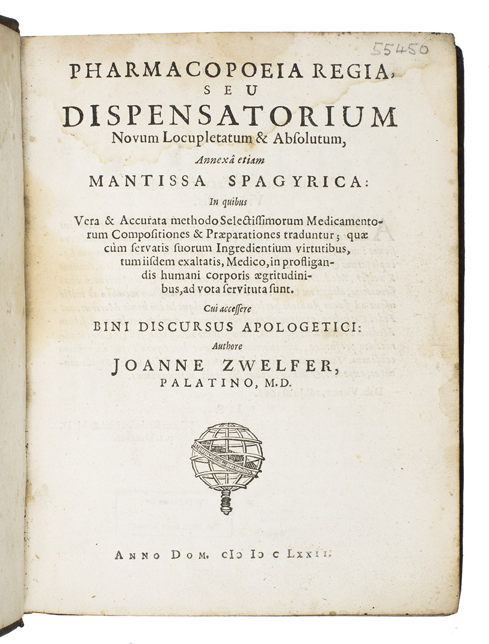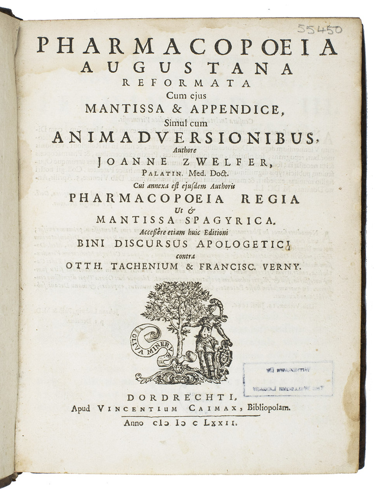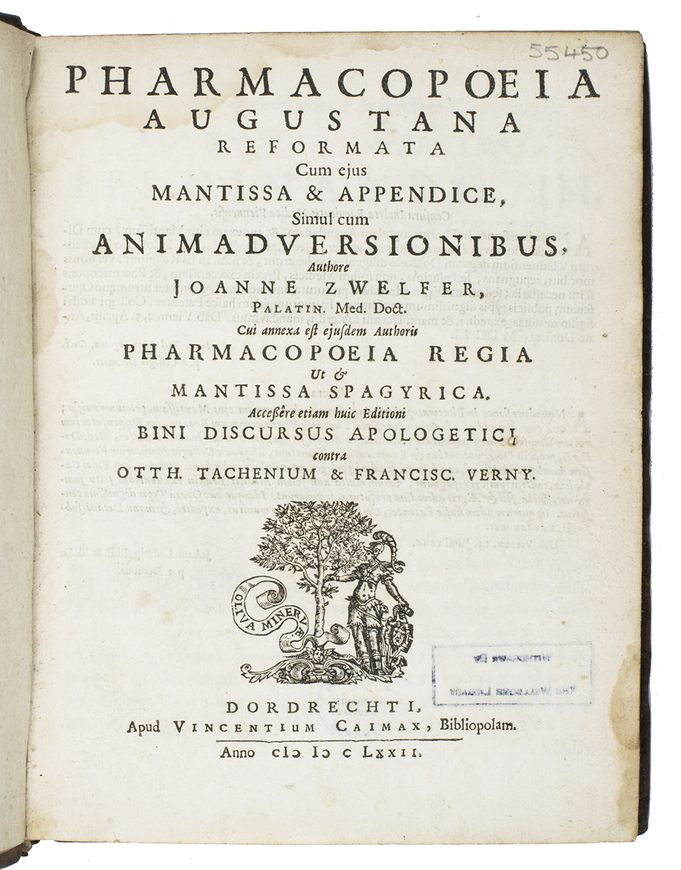 Two works, initially published in two complementary edition and here in a single edition, providing a very sharp critique of the standard German pharmacopoeia. Johann Zwelfer from the Palatinate (1618-1668) worked as an apothecary for 16 years, then studied medicine in Padua. He is first mentioned as the author of the two present works: the Pharmacopoeia regia (vol. 2), and his critical corrections to and commentary on the standard German pharmacopoeia, Pharmacopoeia Augustana (vol. 1). Both were first published in Vienna in 1652 and further editions appeared at Gouda (1658) and Nürnberg (1668) before the present rare Dordrecht edition.
