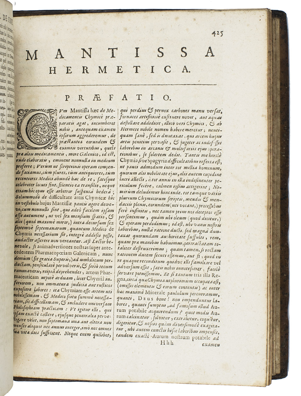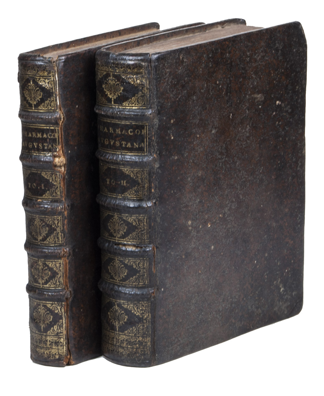Each volume with an owners inscription of Joannis Coste, Pharmacopolae 1676, as well as a library stamp of the Wellcome Library (incl. their cancellation stamp). Lacking the engraved frontispiece in vol. 1 and with wormholes in the margins of vol. 2, sometimes affecting the text. Front hinge of vol. 1 weak. Otherwise in good condition. Jocher, Allgemeines Gelehrten-Lexicon IV (1751), 2141; J. R. Partington, A history of chemistry II, pp. 292, 296-297; Ferguson II, p. 572; Hirsch/H V, 1055; Ferchi 598; Hein/Schwartz II, 787; Scherer, Literatura pharmacopoearum 418d.